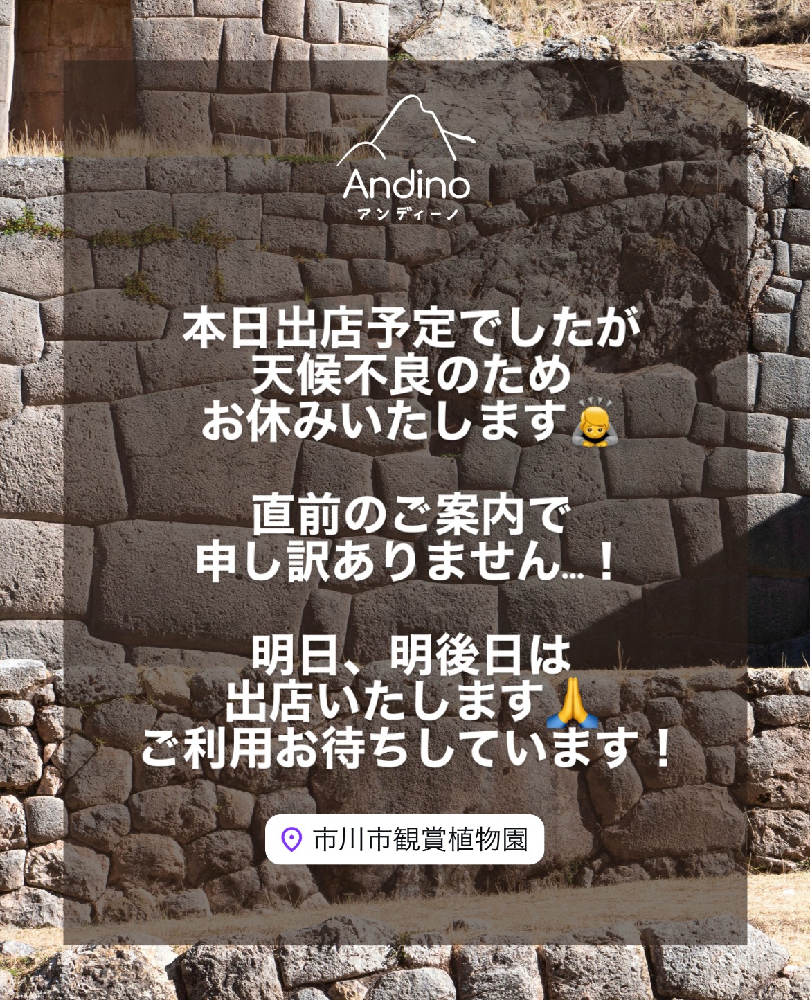 本日出店予定でしたが、天候不良のためお休みいたします🙇